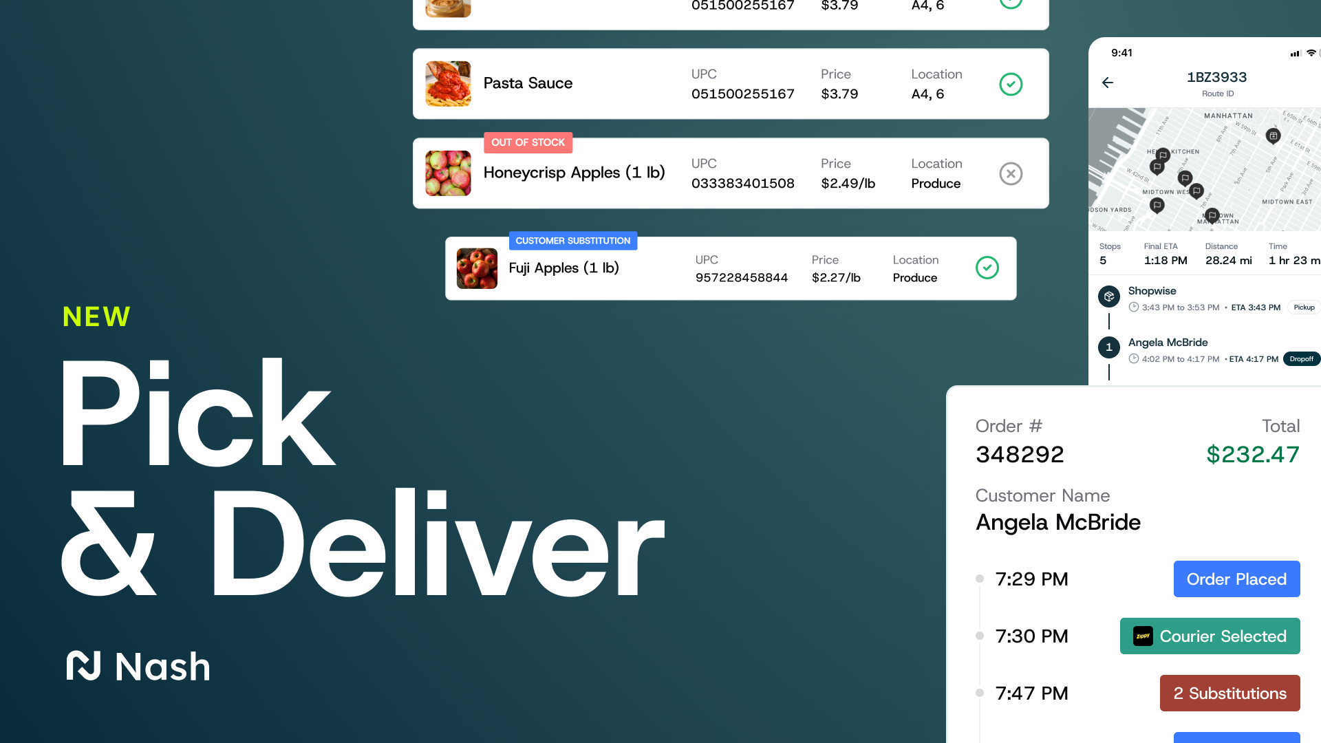 Nash synchronizes store catalogs and inventory, then enables trusted third-party service providers to complete guided picking with barcode scans, substitution rules, and location hints. Once the order is ready, the same courier transitions directly to delivery.
