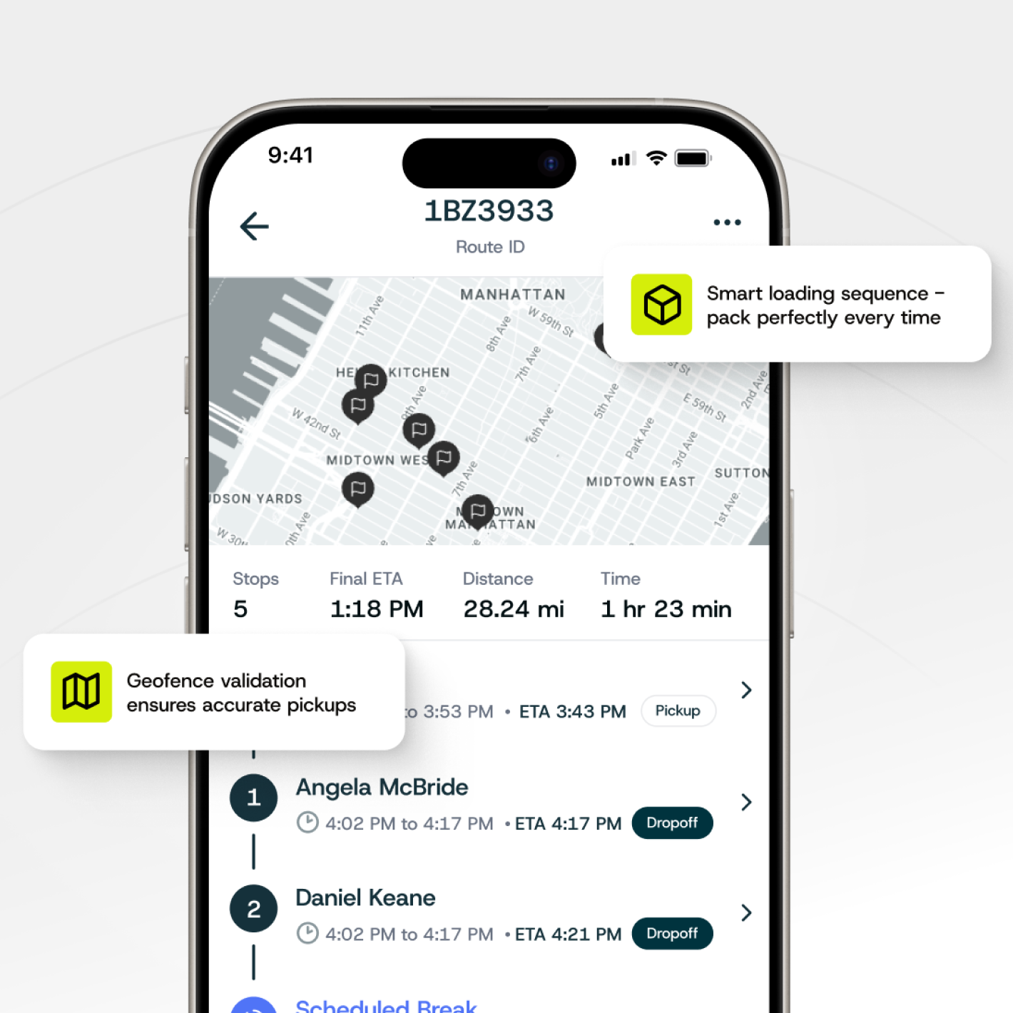 In-app navigation and step-by-step delivery workflows keep drivers on route with live updates at every stop.