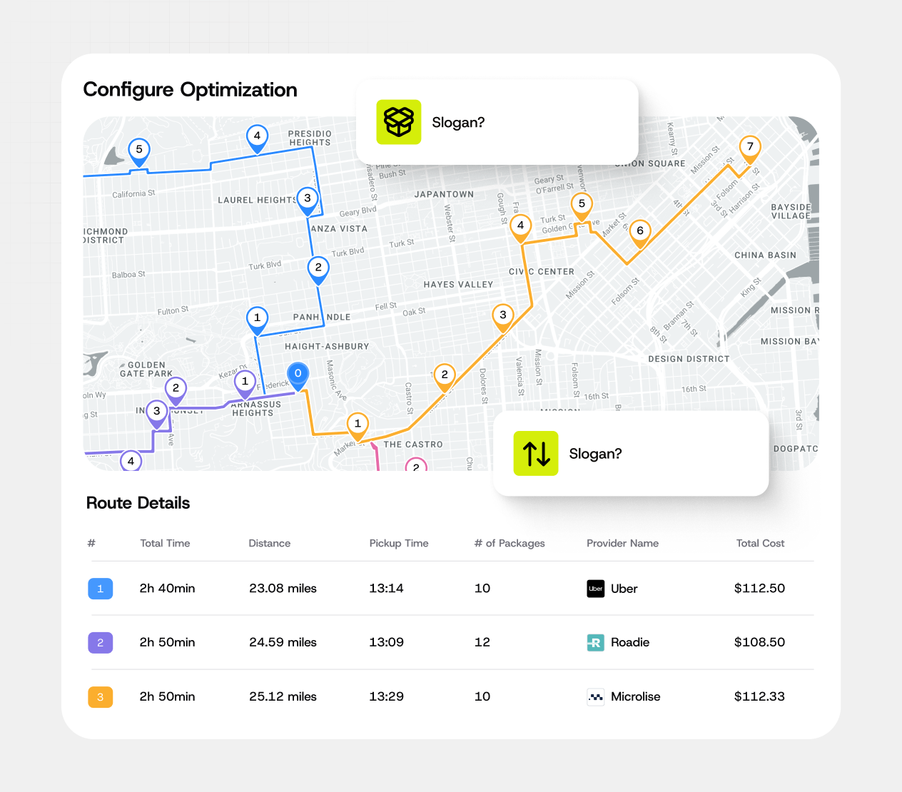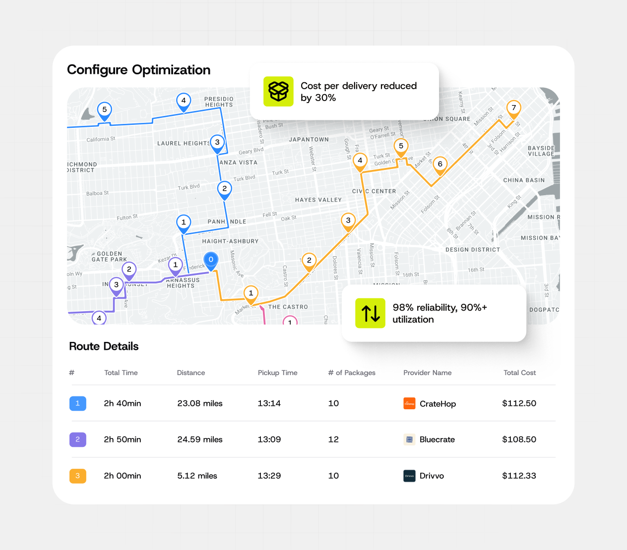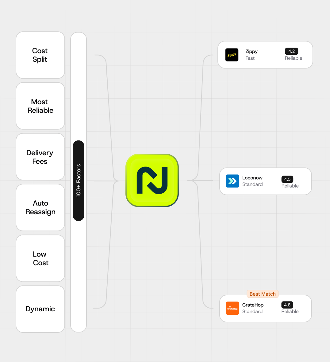 Optimize across cost, speed, reliability, and fleet availability to route every order to the best fit provider or strategy.