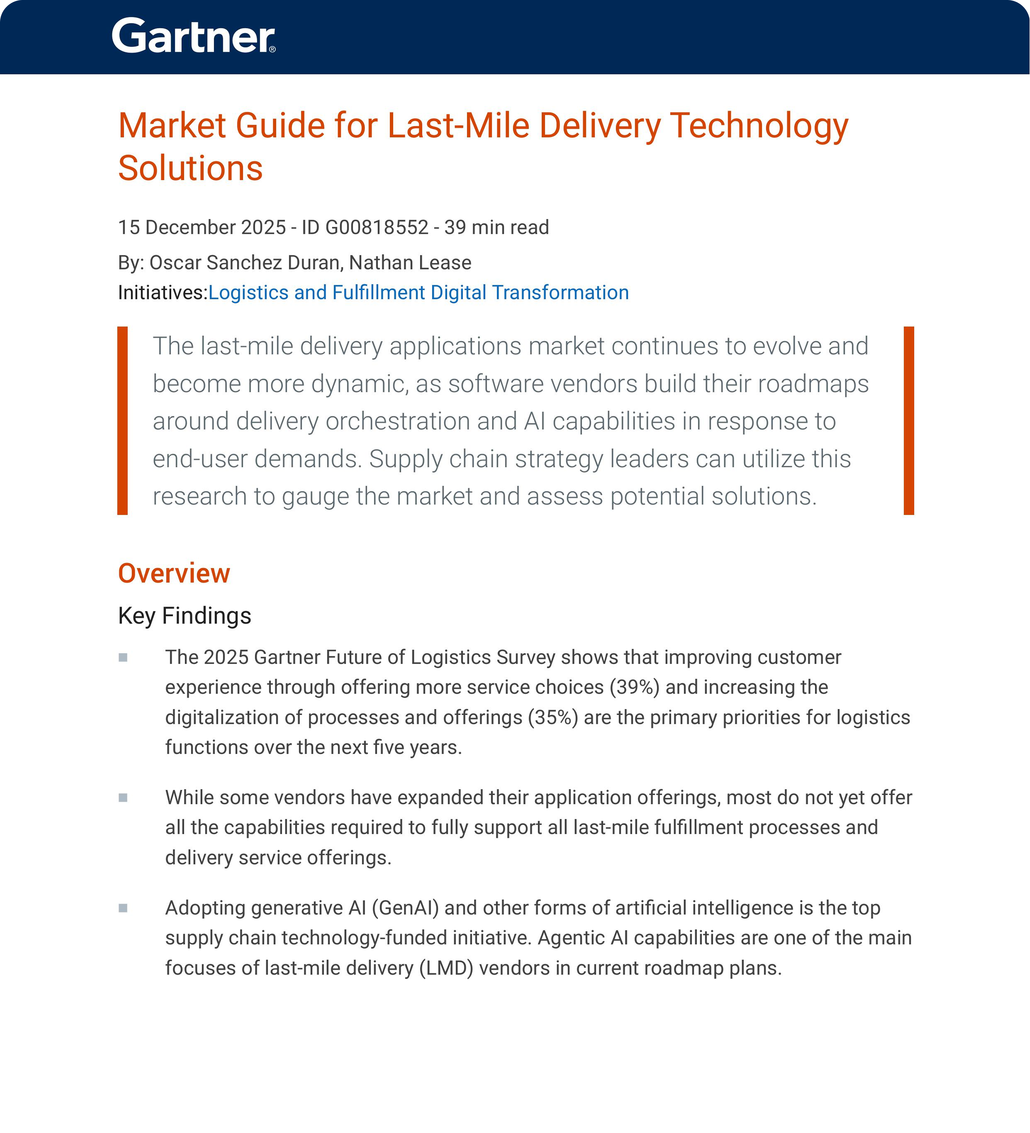 In this Market Guide for Last-Mile Delivery Technology, Gartner provides an in-depth look at how delivery orchestration sits at the core of last-mile solutions, enabling more service options while maintaining control over cost, capacity, and customer experience.